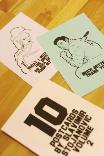 Картичките - Те са сувенир от Сърбия, все пак имат по-дълъг срок на годност от плескавиците. Дизайнер е сръбският великан в дизайна Славимир Стоянович. Всъщност не знам колко е висок, но нивото, което поддържа от години в работата си, е няколко глави над средностатистическото.