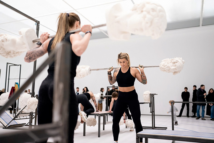 В напълно функциониращите фитнес уреди тежестите са заменени с гипсови реплики на класически скулптури като „Давид“ на Микеланджело и „Аполон Белведерски“.