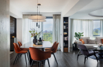 Тук Румен се е сблъскал с още едно наследство от предишния проект – целият под е бил покрит с дъбов рустикален паркет, избран, за да кореспондира с покритието от тиково дърво върху стените. Премахва го и го заменя с много по-стилно и неутрално дървено подово покритие с по-тъмен цвят, което успява да овладее и дефинира цялата дневна зона.
