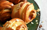Смесете всички съставки без маслото: ако изполвате миксер, вървете от течните към сухите, а ако месите на ръка, направете кладенче от сухите съставки и добавете течните. Маслото сложете чак накрая, на порции. Щом тестото стане гладко, прехвърлете го в намаслен съд да втаса и изчакайте, докато удвои обема си. Обърнете тестото на набрашнен плот и разточете на правоъгълник. Намажете с масло и прегънете правоъгълника на две или на три и отново го разточете. С помощта на остър нож разрежете тестото на равни триъгълници. В долната широка част сложете от плънката с каквото обичате. Подредете ги в тава за печене, застлана с хартия, на разстояние една от друга и оставете настрана за 40-60 минути. Втасалите вече кифлички намажете с жълтък, разбит с прясно мляко, и печете 20-30 минути на 170°С, докато придобият златист загар. Кифличките може да бъдат напълнени с локум, мармалад, по-гъсто сладко или нещо солено. Използвайте филирани бадеми или друга поръска. Съобразете времето за изпичане с големината им.