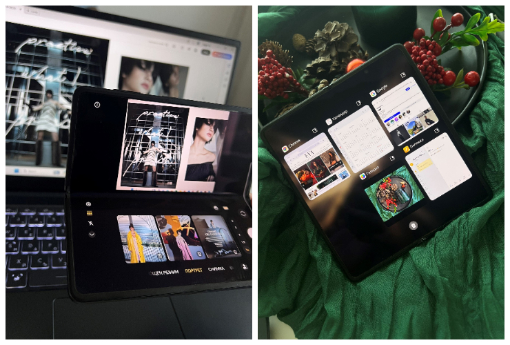 Всяка идея докато тествахме този смартфон, разглеждахме и управлявахме върху големите и ярки дисплеи – 7.95-инчов основен и 6.43-инчов външен екран с ултра-висока честота на PWM димиране, които щадят очите и правят продължителната работа комфортна. Сгъваемият дизайн на HONOR Magic V5 много бързо се доказа като нещо практично, а не просто впечатляващо на спецификации. В редакция, в която рядко всички сме на едно място или на едно мнение , разгънатият дисплей се превърна в естествено работно пространство. За времето, в което го тествахме, организирахме две събития и точно там усетихме колко полезен е този формат: преглеждахме кадри веднага след случването им, правехме селекции за социалните мрежи, редактирахме текстове между срещи и типично по женски, първо гледахме естетиката, а логиката идва след това. Мултитаскингът с два или три прозореца тук не е екстра, а необходимост. Галерия, приложение за редакция и платформа за споделяне вървят паралелно, без усещане за объркване или претоварване. Именно така HONOR Magic V5 започва да се държи повече като личен творчески скицник, отколкото като класически смартфон - пространство, в което идеите се оформят визуално и в движение. Това си проличава най-ясно в моментите на редакционни разногласия. Pantone вече определи „облачно бяло“ за 2026 и логично започват споровете дали да снимаме сесия в „бяло върху бяло“, докато формите почти се губят, или да търсим контраст чрез сенки и текстури. Част от екипа настоява за събитие по вода, с отражения, движение и непредвидима светлина, други искат контролирана, чиста визия на сухо. В тези ситуации разгънатият екран се превръща в място за разговор: увеличаваме детайли, сравняваме кадри, местим акценти и стигаме до решения в движение. Точно тук Google Gemini се намесва най-деликатно, като предлага кои кадри имат потенциал за публикация, помага с формулиране на описания и тагове или дава идеи за визуална последователност, когато денят вече е дълъг, а мозъкът е на редакторски „автопилот“. С други думи - всеки ден.