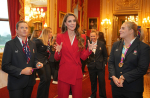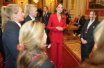 Принцесата на Уелс впечатли с огнено червена визия, докато днес беше домакин на среща с английския национален отбор по ръгби в замъка Уиндзор.