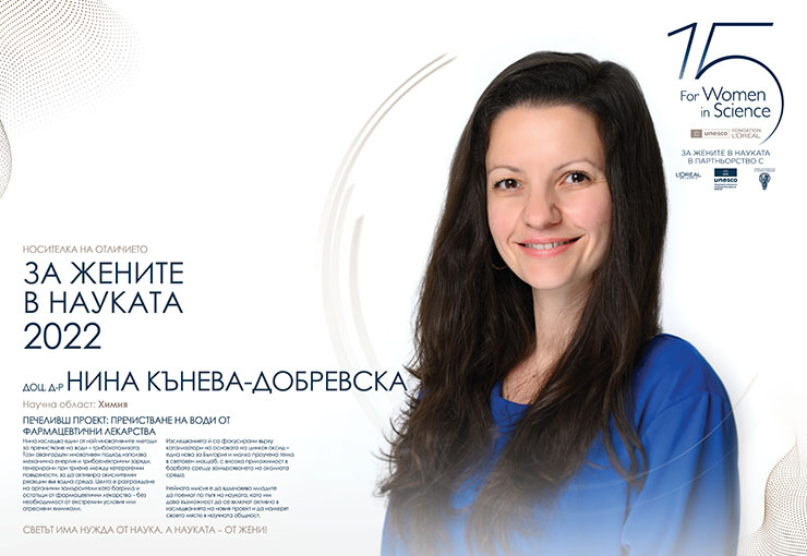 Нина Кънева-Добрeвска е носителка на отличието „За жените в науката“ през 2022. Нейната професионална област е химията – изучава трибокатализата, което енов метод за пречистване на води, при който механична енергия активира химични реакции чрез трибоелектрични заряди. Тя разработва катализатори на основата на цинков оксид за разграждане на органични замърсители като багрила и остатъци от медикаменти, без нужда от агресивни химикали.