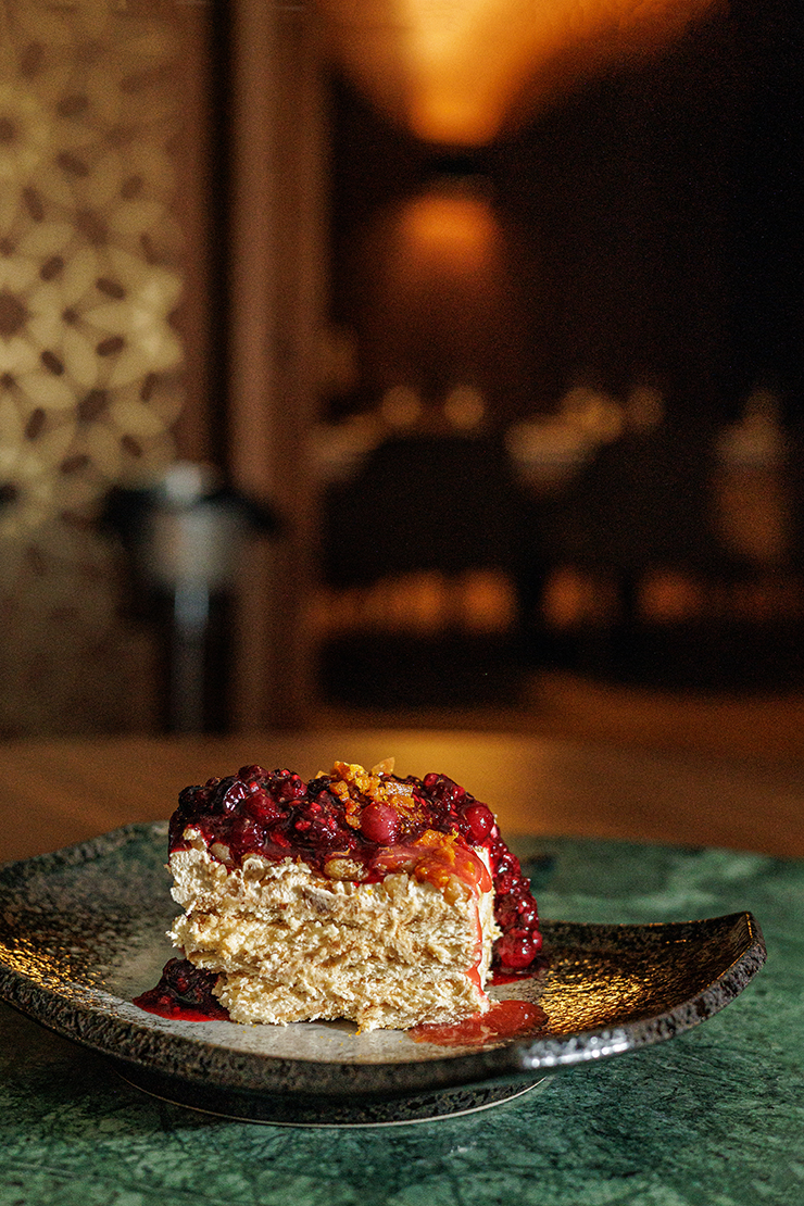 Финалният щрих е домашната бисквитена торта с орехи, гарнирана с горски плодове и корейски меден карамел. Десертът е запазена марка на MIZU. Вдъхновен е от Squid Game („Игра на калмари“) – корейска драма, която разказва за група отчаяни хора, готови да играят игри със смъртоносни последствия, за да спечелят огромна парична награда. Сериалът се превръща в глобален феномен и като всяка силна история ражда своя вкусова интерпретация.