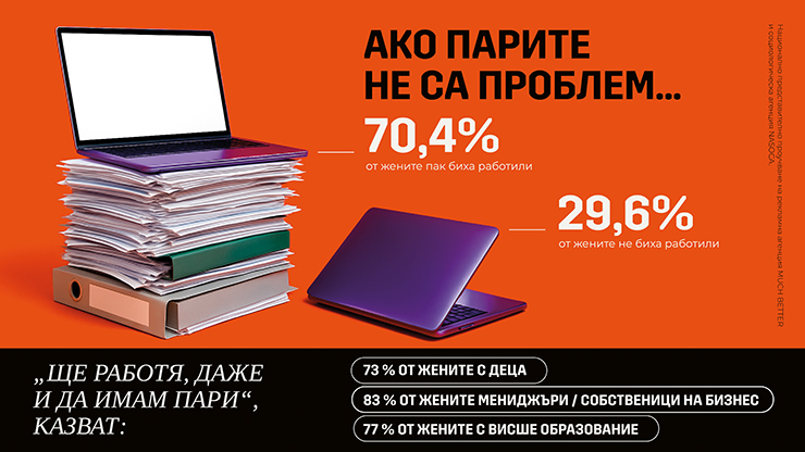 Дори и парите да не са проблем, 70% от българките биха работили. В същото време само 28% от тях имат свободно време за себе си всеки ден, като при омъжените жени процентът пада на 18%, а при необвързаните се вдига до 48%. Цифрите са от разкриващото интересни противоречия изследване „Портрет на българските жени“.