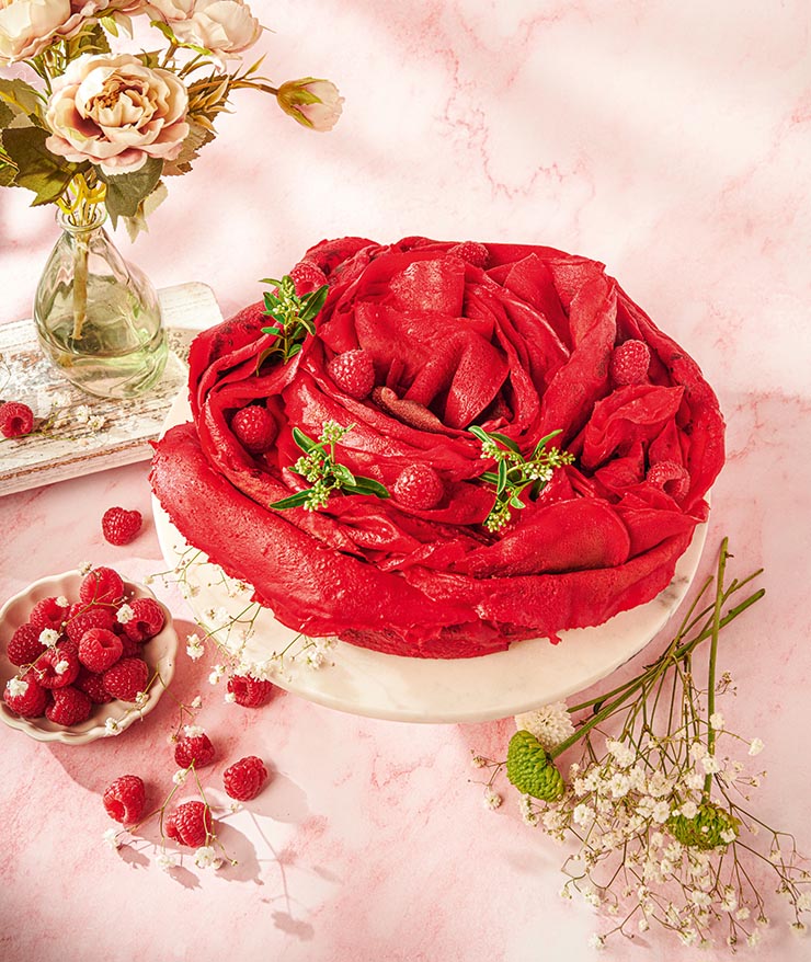 НЕОБХОДИМИ ПРОДУКТИ: 3 яйца, 500 мл прясно мляко, 250 г брашно (пресято), 50 г масло (разтопено и охладено), 2 с.л. захар, 1 ч.л. ванилия (екстракт или захар), ч.л. червена гел боя (или повече според желания цвят), щипка сол ЗА МАЛИНОВИЯ ТОПИНГ: 300 г малини, 80 г желираща захар, 1-2 ч.л. пшеничено нишесте, 1 ч.л. лимонов сок ЗА МЛЕЧНИЯ МУС: 400 мл животинска сметана (35% масленост), 200 г крема сирене, 150 г маскарпоне, 2 с.л. пудра захар, 1 ч.л. ванилия, кората на 1 лайм