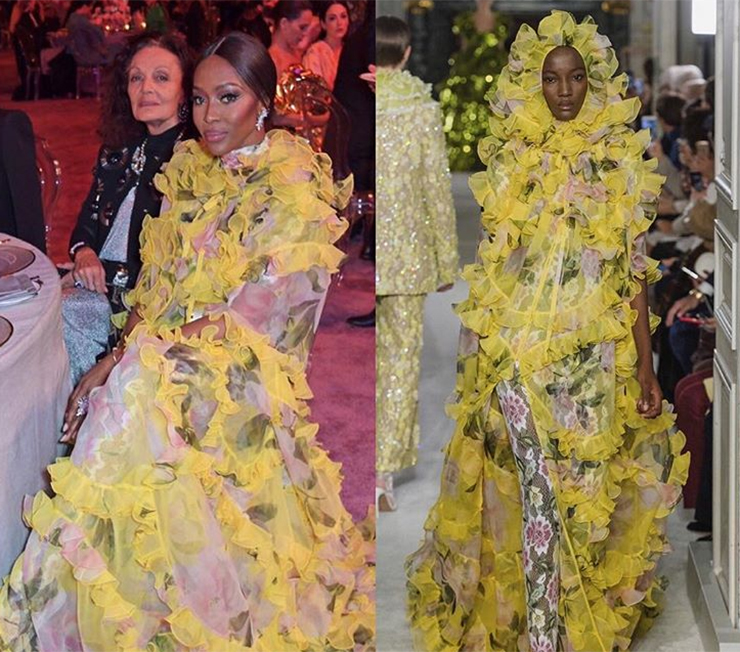 Наоми се появи на червения килим на събитието във внушителна жълта рокля на Valentino, която тази година бе представена на Седмицата на висшата мода. Флоралният couture тоалет обра овациите в звездната вечер.
