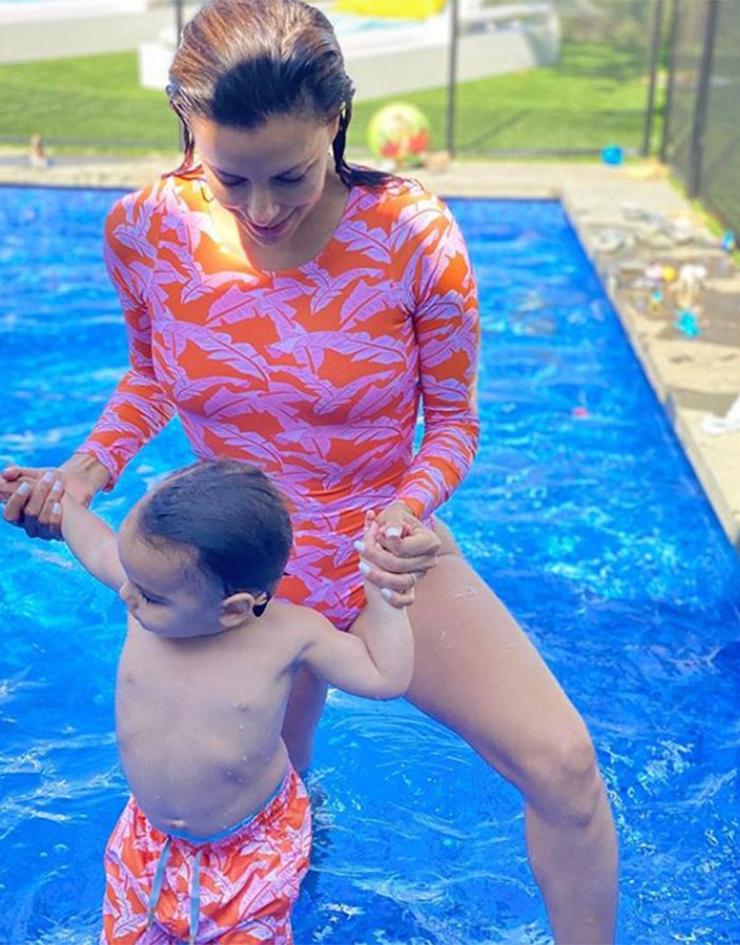 Актрисата се възползва от топлите дни, за да поплува в басейна, заедно с едногодишния си син Сантяго.