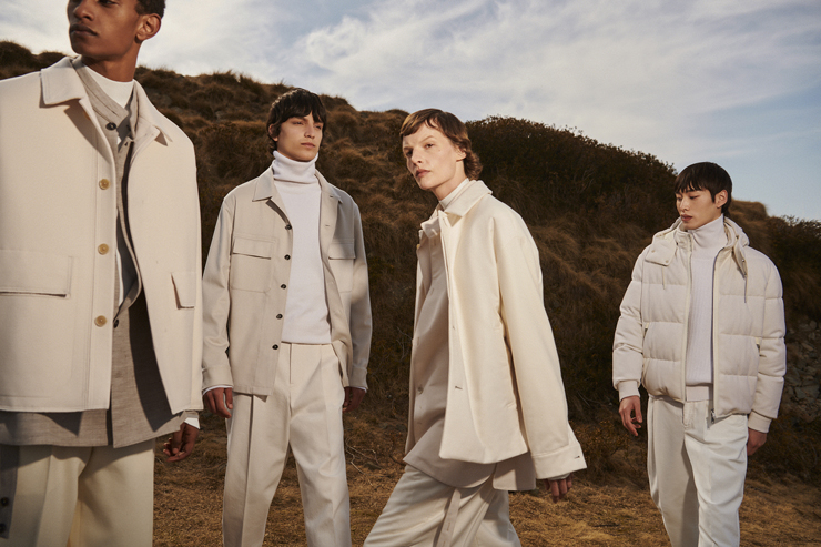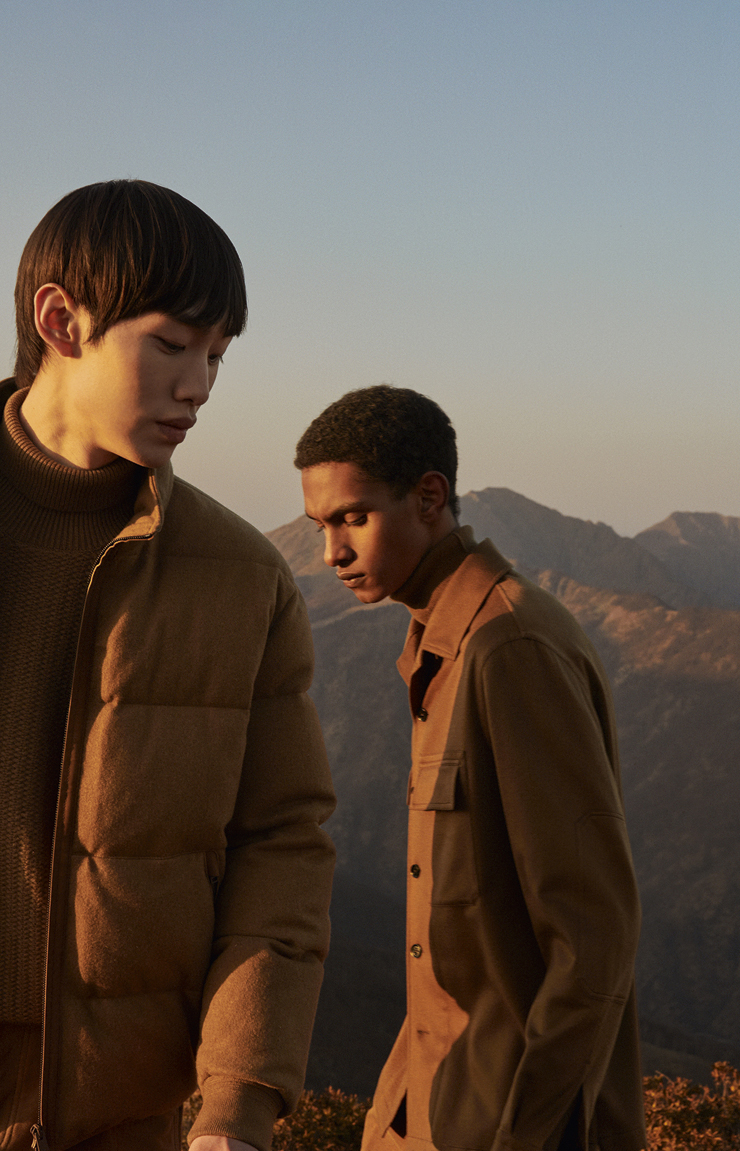 Формите и функциите са подчертани от избор на плътни тъкани, модулирани в органичен масив от цветове. Габардин, вълна, техническа коприна, вълнен деним и кашмир дефинират текстурите на многопластов външен вид, който съчетава леки нотки на цвят „сол“, мразовито бяло и сиво с дълбоки нотки на абаносово черно и махагоново кафяво и акценти на цвят Zegna викуня, ретро месинг и патладжанен кварц.