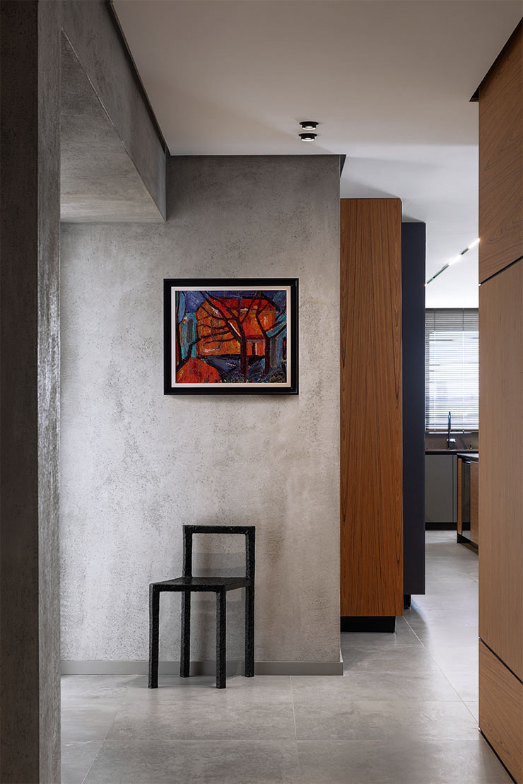 Още с влизането в антрето става ясно, че тук нищо не е оставено на случайността. За Румен Евстатиев тази зона не е просто преход, а откриващ кадър – първото внушение, което задава тона на целия интериор. Стените са в сива гама, с по-сурово излъчване, което създава усещане за дълбочина и характер и подготвя сетивата за останалата част на дома.