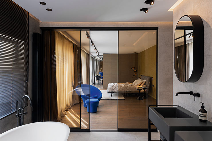 Общото пространство изненадва с големите си размери. Интересно и нестандартно е разположението на овален обем, в който са обособени баня и килер. Дизайнерът е успял да впише това доста предизвикателно присъствие, като го е покрил с много фини листове метал и му е придал изявено сурово излъчване.