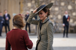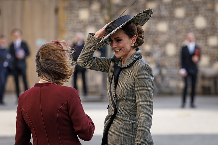 Истинско изпитание обаче се оказа за Кейт да задържи шапката на мястото си. Бурен вятър, проливен дъжд, задължителни ръкостискания, усмивки, етикет… и през цялото това време трябваше да се бори с вятъра, за да не отвее шапката й.