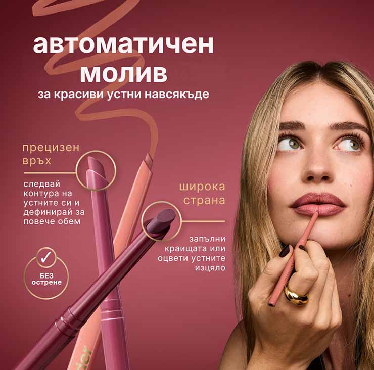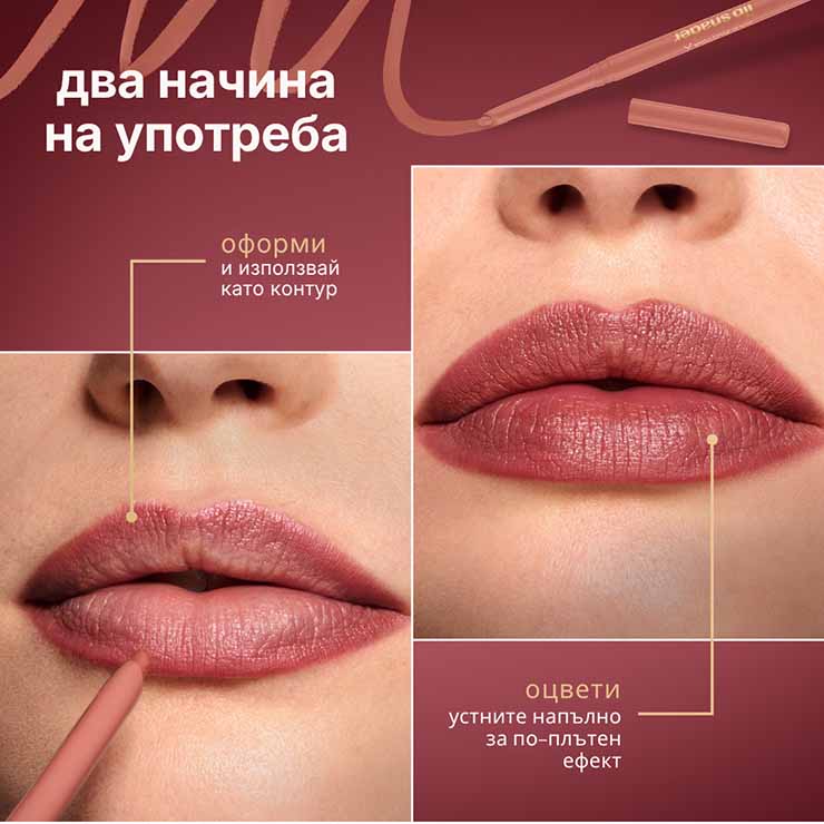 Двойната им функция – оформя, подчертава и запълва устните с лекота. Формулата им осигурява наситен цвят и дълготрайно покритие, което не се размазва и издържа през целия ден.